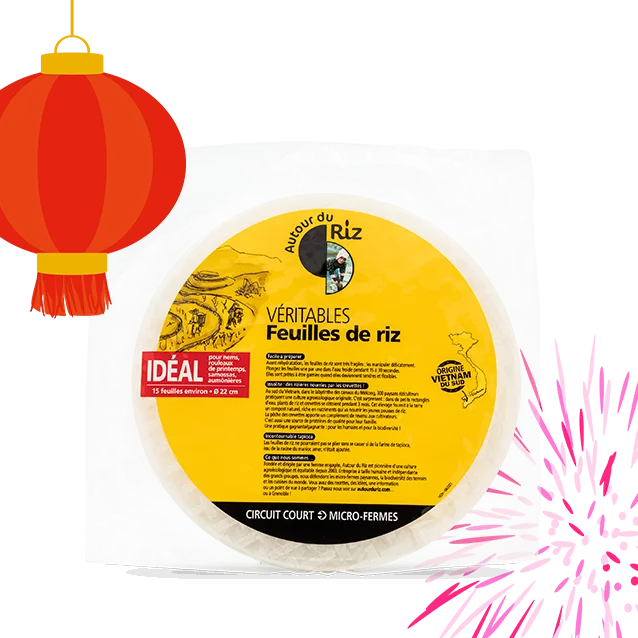 Nos feuilles de riz bio sont fabriquées pour nous dans le delta du Mékong en suivant une recette ancestrale. Ce qui fait aussi leur différence ? Le riz est cultivé de manière insolite dans un petit terroir protégé. Écoutez ça : les paysans élèvent des crevettes dans leurs rizières quand le riz bio a été récolté. Excellent pour régénérer la terre !