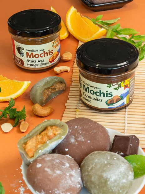 Nous avons pensé à vous. Vous aviez déjà nos Farine de riz gluant, et nos Préparations pour Mochis, voici le complément indispensable pour faire de divins mochis maison : les Garnitures pour Mochis prêtes à l’emploi.