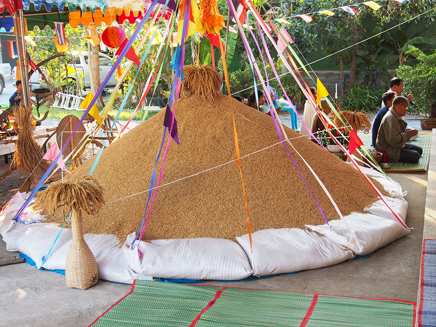 Depuis des temps immémoriaux, dans tous les pays d’Asie, la plantation du riz nouveau est précédée par des cérémonies aux divinités, pour réclamer des pluies abondantes et l’absence de fléaux naturels. Ces croyances perdurent dans les campagnes où elles donnent lieu à des fêtes traditionnelles, des prières qui rassemblent les communautés. Dans la campagne thaïlandaise, après la cérémonie du Premier labour royal qui se déroule à Bangkok, les paysans rendent hommage à Mae Phosop, la déesse Mère du Riz.