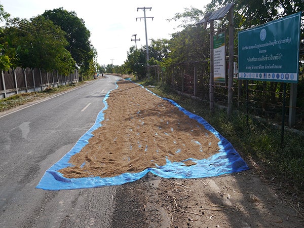 Tout juste récolté, le riz sèche au soleil le long de la route avant d’être livré à la coopérative.