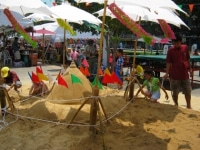 Alors qu’on se retrouve en famille, des concours de pyramide de sable, les chedhis, sont organisés dans l’enceinte des temples. Ce sont de véritables œuvres d’art aussi éphémères que les sculptures de glace que nous pouvons admirer l’hiver dans certaines stations de ski alpines ! Autres latitudes, autres mœurs !